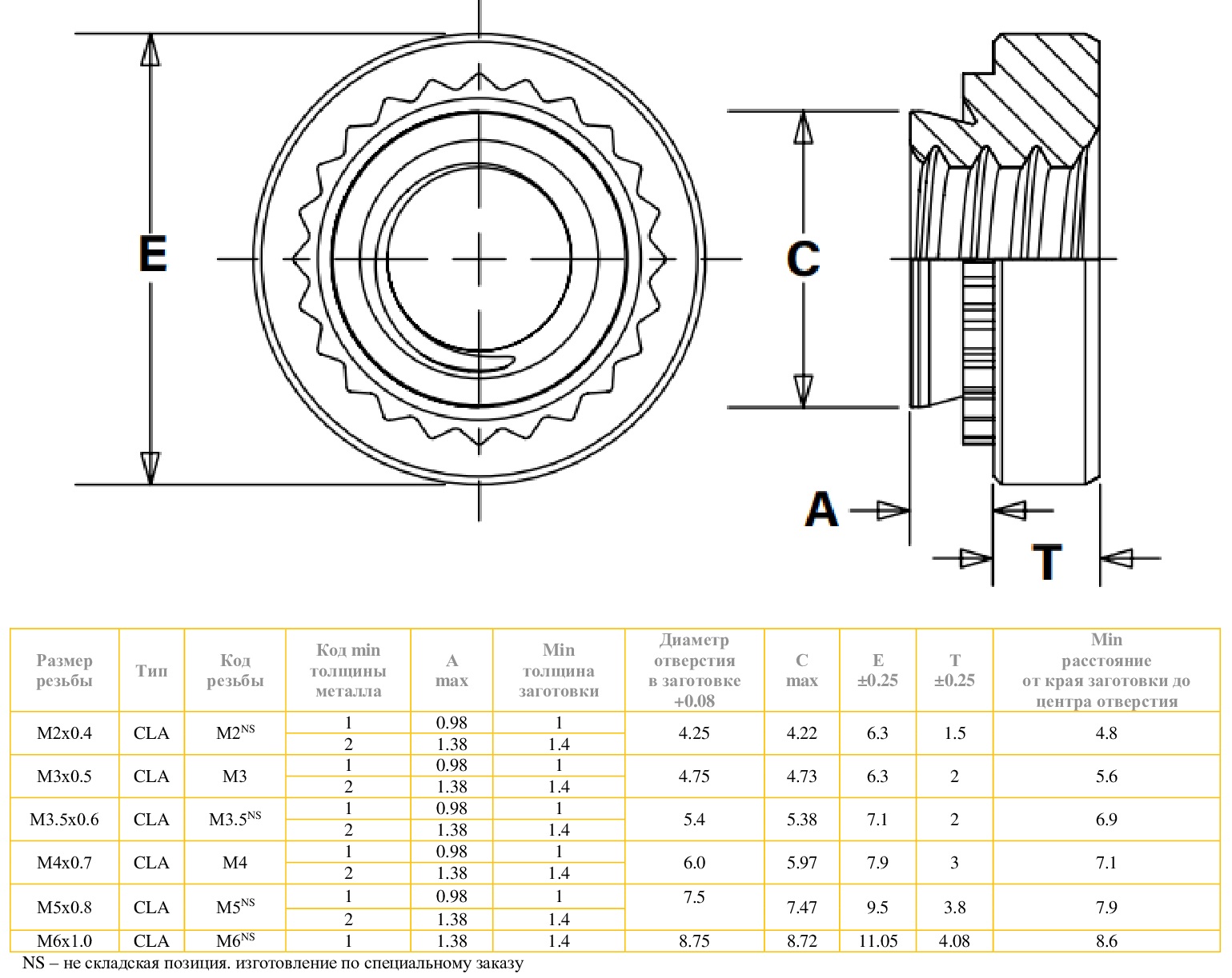Стандартная запрессовочная гайка тип CLA из алюминия имеет умеренную устойчивость к коррозии. Размерность от М2 до М6, два варианта высоты обратного конуса гайки в каждой размерности, выбор которого зависит от толщины материала, в который будет запрессовываться крепеж. Предназначена для установки в стальные и алюминиевые заготовки (совместима с анодированным алюминием) твердостью до HRB 50, толщиной от 1 мм. Запрессовочная гайка из алюминиевого сплава 6061 применяется для монтажа в заготовки из алюминиевых сплавов для предотвращения гальванической коррозии, возникающей при использовании разнородных материалов. Достоинства данного типа крепежа: низкая масса при умеренной прочности, устойчивость к усталости, идеален для компонентов, подверженных циклическим нагрузкам, возможность термической обработки (отжиг или искусственное старение). Алюминиевая запрессовочная гайка относится к крепежу с умеренной коррозионной стойкостью, естественным образом образует на своей поверхности защитный оксидный слой, хорошо сопротивляется атмосферной коррозии и воздействию многих агрессивных химических веществ, однако, подвержена коррозионному растрескиванию под напряжением. Для повышения коррозионных свойств алюминиевые детали подвергают дополнительной обработке поверхности, например, анодированию, покрытию лаком или покраске. Алюминиевый сплав 6061 широко применяется в авиастроении, судостроении, автомобильной промышленности, для изготовления строительных конструкций, в производстве оборудования для пищевой промышленности, потребительских товаров электроники, фото- и видеотехники, спортивного инвентаря и т.п.