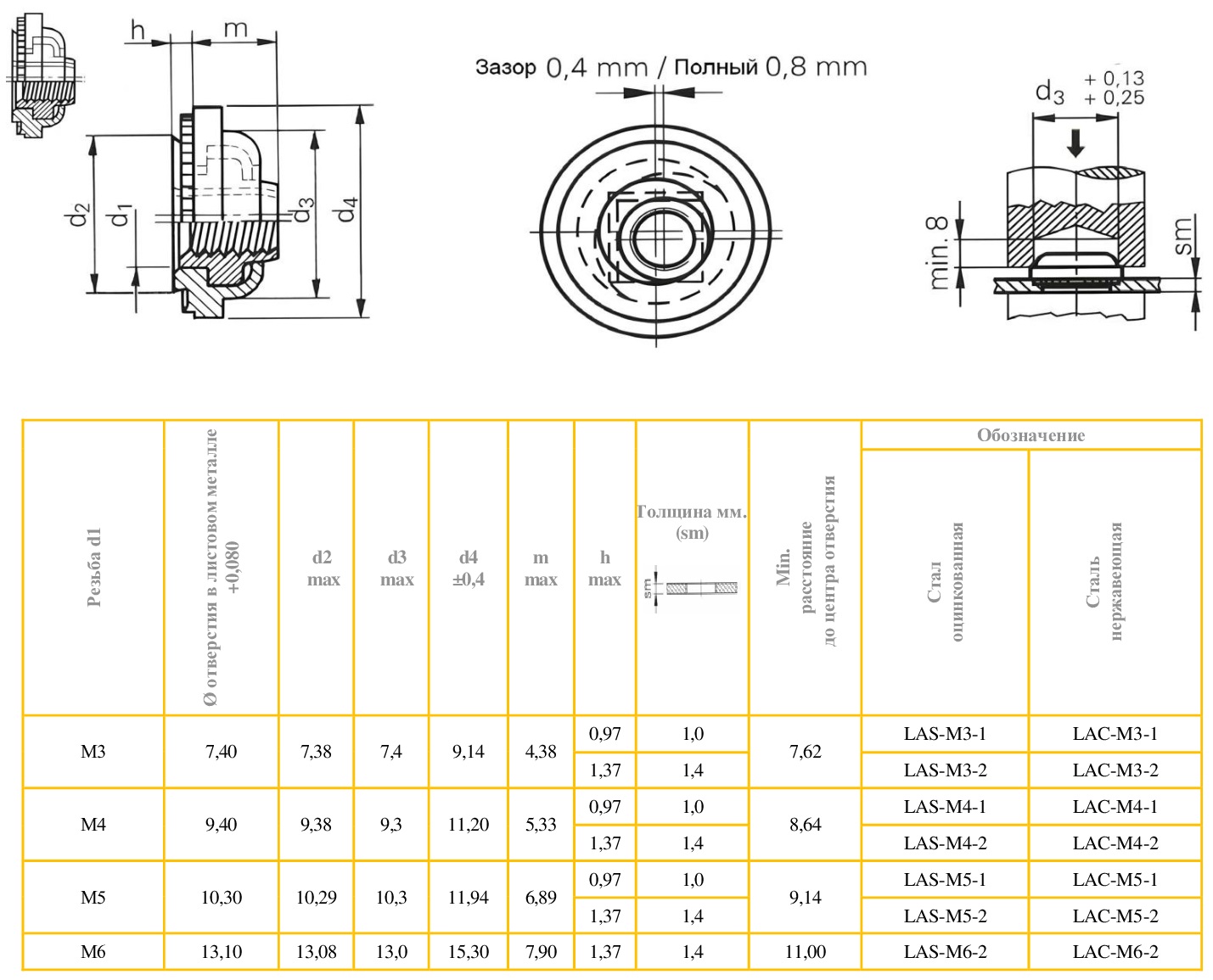 Запрессовочная гайка LAS относится к самоконтрящемуся крепежу с преобладающим крутящим моментом, т.е. в процессе затяжки обеспечивается практически одинаковый крутящий момент независимо от величины прилагаемой осевой нагрузки. Высокая осевая прочность с повышенным сопротивлением крутящему моменту (провороту) и отрыву. Устанавливается заподлицо с одной стороны заготовки. Резьба в подвижном сердечнике гайки обеспечивает дополнительную прочность и надёжность соединения. Размерность от М3 до М6. От одного до двух вариантов высоты обратного конуса гайки в каждой размерности, выбор которого зависит от толщины материала, в который будет запрессовываться крепеж. Рекомендована для монтажа в стальные и алюминиевые заготовки твердостью до HRB 70 и толщиной от 0,97 мм.