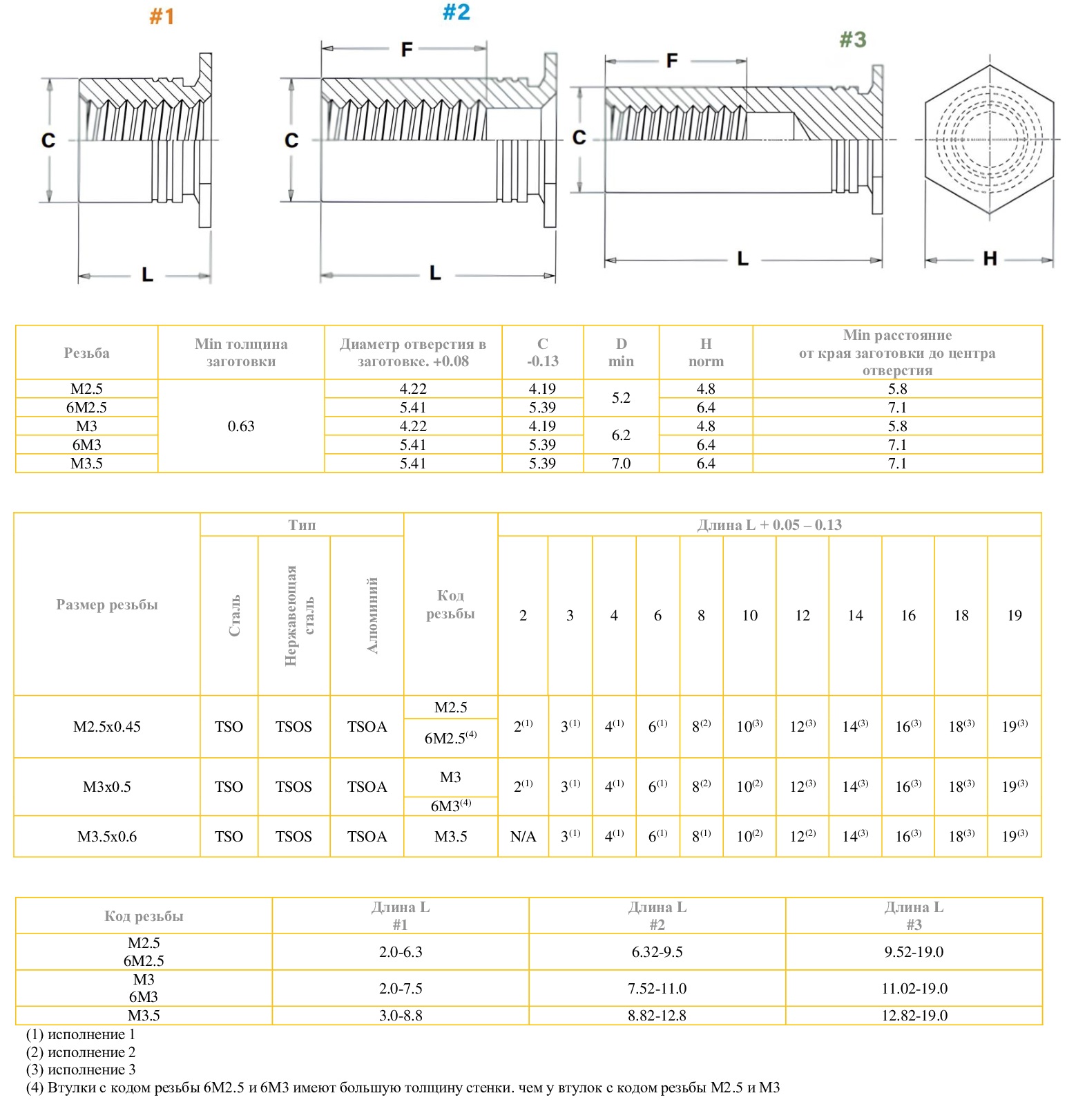 Втулки полнопроходные, запрессовочные из оцинкованной стали с шестигранным основанием для минимальной толщины металла 0,63 мм, применяются для материалов твёрдостью до HB 150.